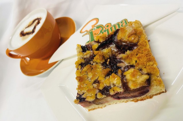 Und unser ganztägiger Dauerbrenner: Ein Stück Blechkuchen + Cappuccino “Italia” um € 7,60.